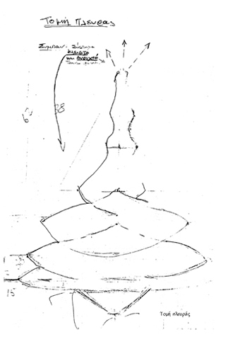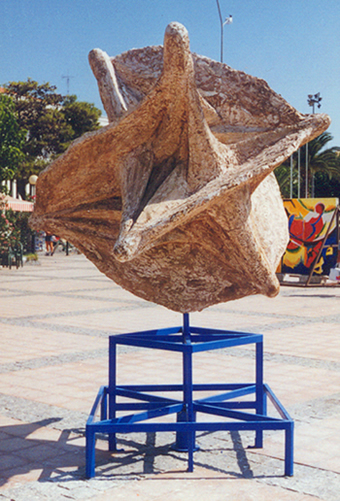 Γλυπτό διαστάσεων 260εκ. x 230εκ.Τις κορυφές των τετραέδρων προτίμησα, σ' αυτήν την φάση, να τις κάνω ημισφαιρικές, υπονοώντας το γενικό σχήμα. Η βάση από σίδερο είναι η "γραφική" παράσταση σε δύο επίπεδα της κάτοψης του κανονικού σχήματος.