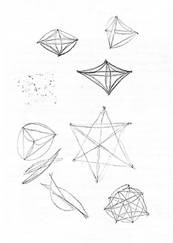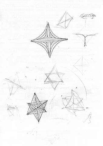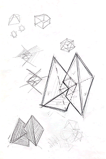 Η σύνθεση ξεκινά παίρνοντας ως πρώτο παράγοντα το κανονικό τετράεδρο.Τα τέσσερα σημεία των κορυφών του δηλώνουν τη συνάντηση-τομή των έξι ακμών (γραμμών) του. Οι ακμές του με τη σειρά τους δηλώνουν τη συνάντηση-τομή των τεσσάρων εδρών (ή επιπέδων) του.