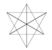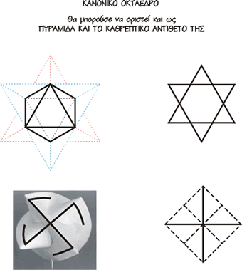ΣΧΗΜΑΤΑ 5-6: Αν ενώσουμε τις απέναντι αιχμές του εξάκτινου αστεριού καθώς και περιμετρικά, έχουμε την γραμμική παράσταση δύο κανονικών τετραέδρων που εντάσσονται σε κύβο, ή την προοπτική παράσταση ενός κανονικού οκταέδρου.
