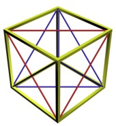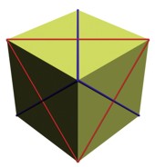 Οι οκτώ κορυφές της σύνθεσης συμπίπτουν με τις κορυφές του κύβου. Οι δε ακμές των δύο τετράεδρων είναι οι διαγώνιες των έξι εδρών του κύβου. Μ’ αυτή την προσέγγιση γίνεται δυνατό να θεωρηθεί ότι ο κύβος περιέχει σαν σκελετό (ή ανάλυση) τη σύνθεση των δύο τετράεδρων.
