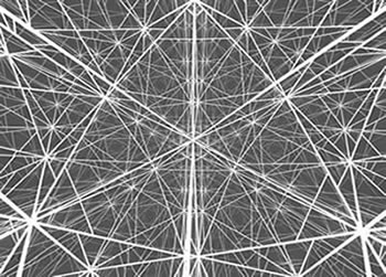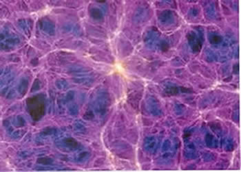 ΔΕΞΙΑ: προσομοίωση από το Virgo Consortium, που δείχνει την δομή του σύμπαντος σε μεγάλη κλίμακα. Είναι προφανής η αντιστοιχία της λογικής του δικτύου της διάταξης των γαλαξιών με το δίκτυο που παράγουν οι ακμές του τετραέδρου. Μια καμπύλωση των ακμών του τετραέδρου θα έκανε τις εικόνες σχεδόν ταυτόσημες.